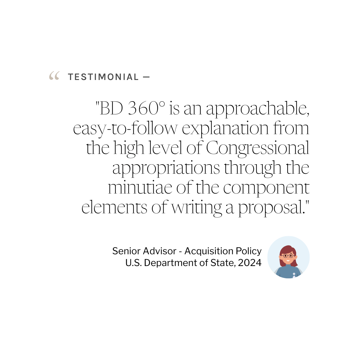 BD 360°® is a clear and systematic framework designed to empower government contracting professionals to effectively compete in the federal marketplace.